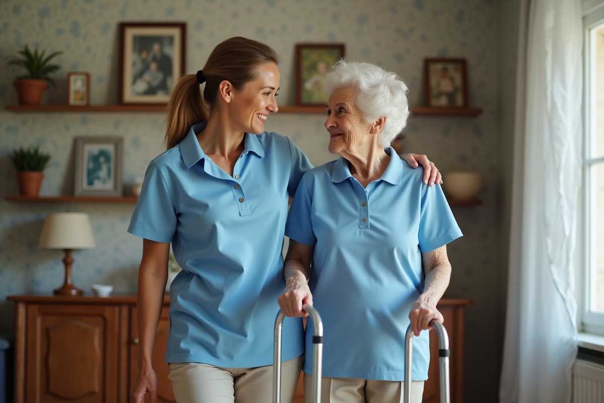 Aide-soignante aidant une personne âgée dans un appartement français